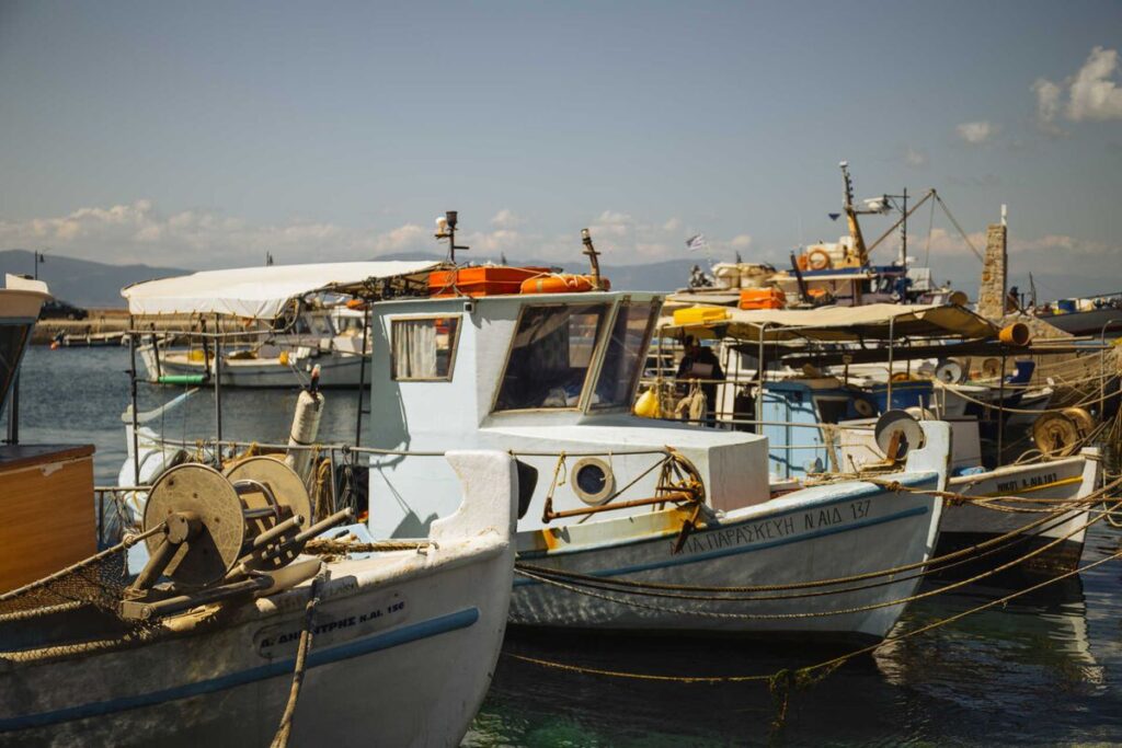 Καφέ και ταβέρνες απλώνονται γύρω από την πλατεία, με τραπεζάκια σχεδόν πάνω στο κύμα, ενώ λίγα μόλις μέτρα πιο πέρα βρίσκονται οι ψαρόβαρκες και το μικρό λιμανάκι.