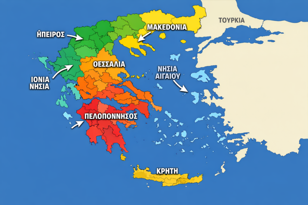 Χάρτης της Ελλάδας με βασικές γεωγραφικές περιοχές της χώρας. Ο χάρτης δείχνει ενδεικτικά ορισμένες από τις κύριες περιοχές όπου βρίσκονται πολλά ελληνικά χωριά, τόσο σε ηπειρωτικές όσο και σε νησιωτικές περιοχές.