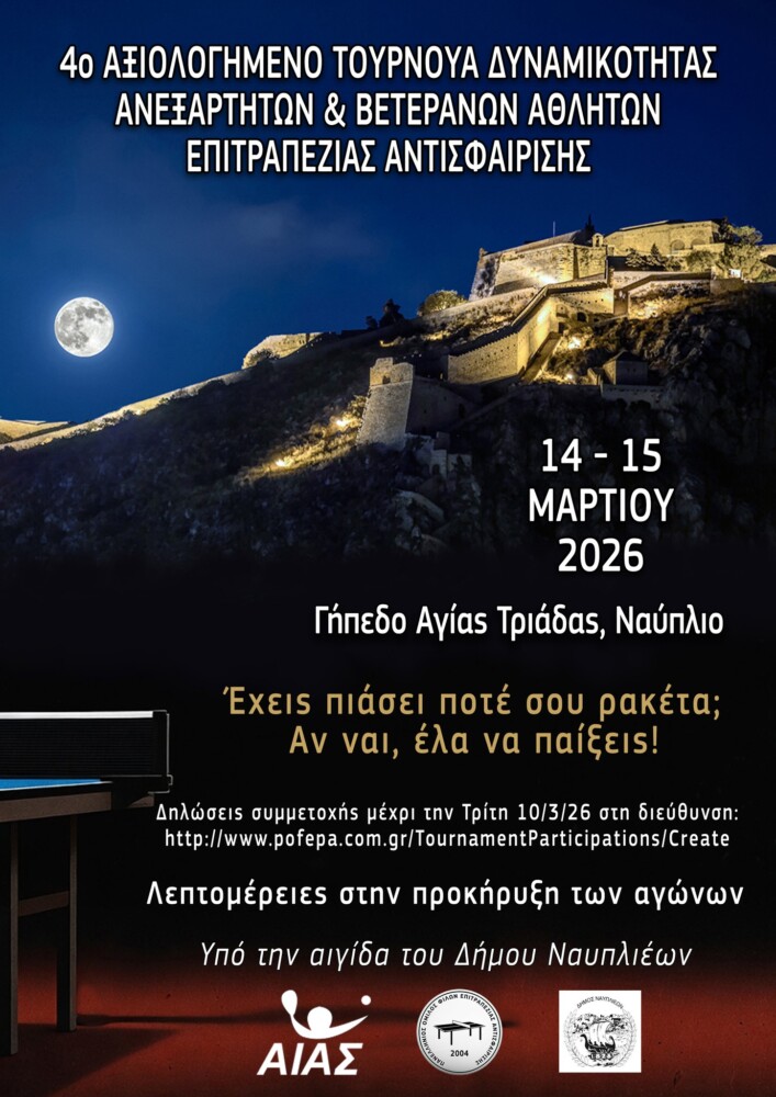Το 4ο Αξιολογημένο Τουρνουά Δυναμικότητας Ανεξάρτητων & Βετεράνων της ΠΟΦΕΠΑ έρχεται να ενώσει τον παλμό του αθλητισμού με τη γοητεία μιας από τις πιο ιστορικές και ρομαντικές πόλεις της Ελλάδας: το Ναύπλιο.